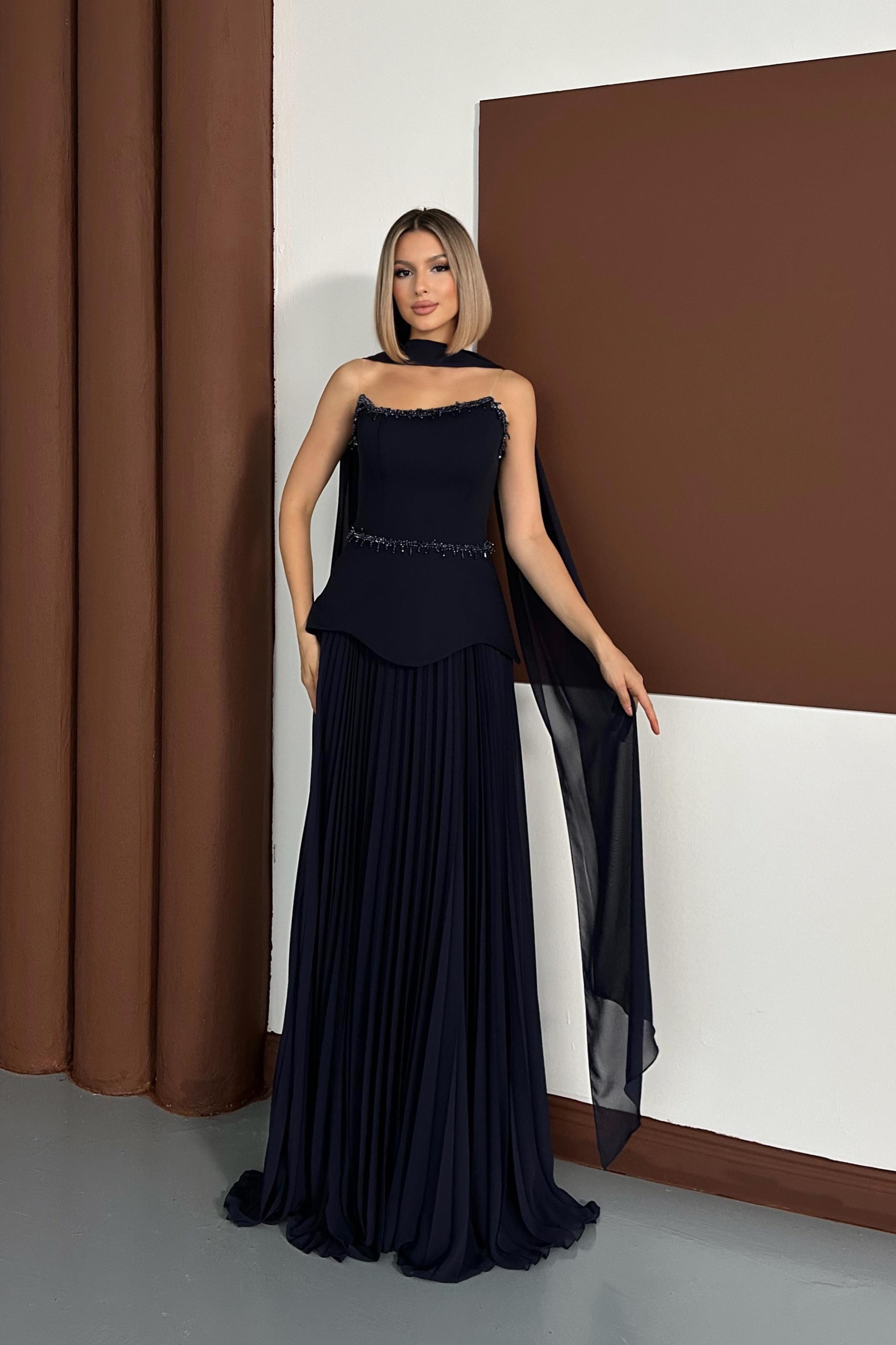 Straplez Boncuk İşlemeli Eteği Piliseli Lacivert Abiye Elbise (L0011725)